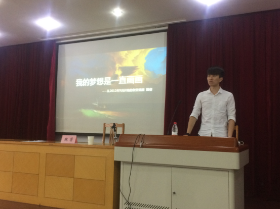 下午3时10分,讲座正式开始。魏睿首先由“梦想”引入,告诉同学们他的梦想其实就是一直画画,由此展开其从小到大的发展历程。魏睿小时候酷爱画画,并展现出优秀的天赋,坚持画画。高考之后,魏睿来到了麻豆官方网站
